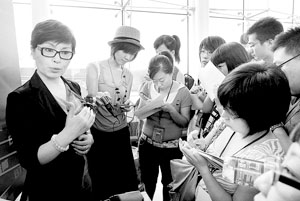 李瑞英還沒走兩步,就有幾名攝影記者躥到了她面前,拿起相機(jī)按了一通快門。李瑞英只好停下腳步,等攝影記者拍完后,再次向采訪區(qū)走。