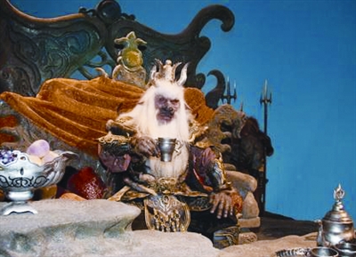 當記者來到攝影棚時,正在拍攝的場景是牛魔王殿前獨酌的一場戲,身為主角的唐僧師徒四人則不見蹤影,只見魁梧威嚴、黑臉白須的“牛魔王”端坐在寶座上,數十名青面獠牙的“小妖”分列兩旁。(周文韜)