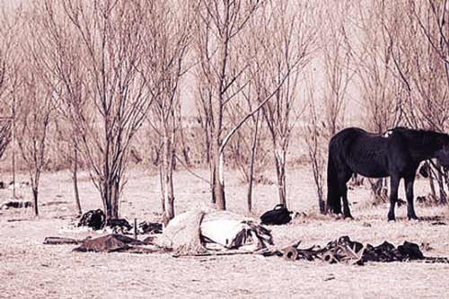 記者6日來到拍攝現場,發現一大片平整的濕地上異常熱鬧,十多匹高頭大馬正在不停地啃著野生紅柳的樹皮,約30多臺各種車輛停放在濕地上,地上到處是垃圾和隨手扔掉的黑白塑料袋……
