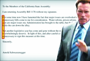 湯姆·阿米阿諾與幾位議員提出了一項(xiàng)法案,希望加州能在舊金山地區(qū)創(chuàng)建基礎(chǔ)設(shè)施融資區(qū),采取融資計(jì)劃推動(dòng)這些地區(qū)的基礎(chǔ)設(shè)施建設(shè)。通常此類法案如果不是問題太多的話,州長會(huì)予以批準(zhǔn)。但湯姆·阿米阿諾與施瓦辛格素來看不對眼,本月初又在集會(huì)上批評(píng)施瓦辛格的施政方式,還大罵他是“騙子”。施瓦辛格否決了這項(xiàng)提案,并在否決信上以藏頭詩的形式對阿米阿諾議員予以反擊,即信件每行第一個(gè)字母連起來就是“T(Tom),I f k you,A(Arnold Schwarzenegger)”。州長辦公室新聞發(fā)言人稱此事純屬巧合,“試想每天寫那么多否決信,這種巧合的出現(xiàn)是遲早的事。”