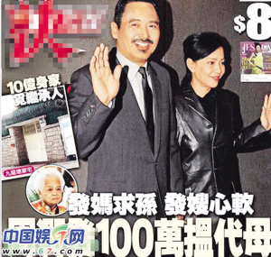 昨日有香港媒體報道,年屆九旬的發媽陳麗芳希望發哥能夠找代孕,為周家添后,一圓20多年的夙愿,同時也為周潤發10億元的家產“制造”繼承人。據知,有人提出以一百萬元代價,在內地尋覓優質代母,務求一擊即中。