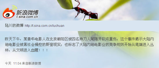 9日上午11時04分,導演陸川在微博稱:“昨天下午,某青年電影人在北京朝陽區被四名持刀人尾隨并砍成重傷。”陸川還在微博中分析,懷疑此事和某些黑勢力有關。他還表示:“這個事件標志了大陸內地電影業的競爭規則開始從筆端進入叢林,從文明進入血腥。。