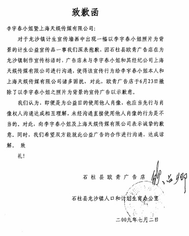 宣傳畫上端印著的“生男生女一樣好,女兒也是傳后人”口號被不少網友視為是對李宇春的諷刺。致歉函中,龍沙鎮計生辦坦承石柱縣歐青廣告店在制作宣傳標語時,未與李宇春及其經紀公司天娛傳媒進行溝通,使得該宣傳行為給李宇春帶來諸多困擾。致歉函還透露:“石柱縣歐青廣告店已于6月23日撤除了以李宇春小姐之照片為背景的宣傳廣告以示歉意。”記者朱雅清