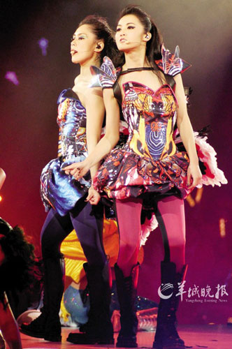前晚的演唱會場面相當華麗,TWINS一共換了五套華服,每套都以不同的主題場景配襯,絕對凸顯“女人味”。一開場,兩人以“冰雪女王”的科幻裝束亮相,取“破冰重出”之意;接著是“小蜜蜂”昆蟲造型,寓意“辛勤勞作望有所獲”;然后是“絢麗大花”小短裙,顯示兩人如花般“美麗綻放”;還有“芭比娃娃”俏麗打扮,取意“依然經典可愛”;第五套服裝是夸張“鹿角”配黑白短裙,在《下一站天后》的歌聲中再次展開對“天后夢”的追逐……直到返場時,她們才換回樸素的灰色短裙,裙子上印著她們此次演唱會各自的造型,似乎又回到了現實。