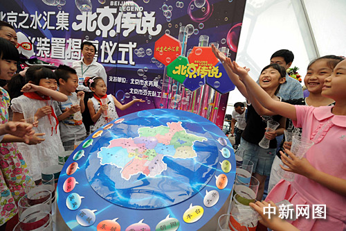 “北京之水匯集北京傳說”活動是圍繞北京兒藝六一大戲《北京傳說》中的節(jié)水環(huán)保主題而開展的、面向北京所有小學(xué)生及學(xué)齡前兒童的大型環(huán)保節(jié)水公益行動。現(xiàn)場12位節(jié)水小明星代表一起把他們從北京各水系取來的水標本匯集到“北京之水”大型環(huán)保容水裝置中,這一裝置高1.5米,它以藍色水波紋狀物體為底座,上方圓弧狀轉(zhuǎn)盤中用顯著顏色標識出北京水系分布情況,5月28日至6月1日《北京傳說》演出期間,該容器將放置在水立方場內(nèi),成為一道環(huán)保新景觀。