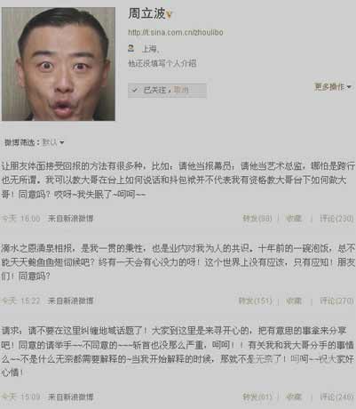 采訪首先圍繞關周分手。周立波說:“我很無辜,老關也很無辜,有人在中間挑事,我們會查的。”他告訴記者,知道媒體“踢爆”兩人分手一事時,他正在與前紐約警察局華人局長莫虎一起喝酒,而當天下午他剛在無畏號航母上看了“珍珠港事件”的紀錄片,當時他的第一個反應是“沒想到我也遇上珍珠港事件了”。由于當時認為是關棟天向媒體“踢爆”此事,而且當晚酒喝得比較多,因而在微博上寫下了幾段很有爭議的博文,包括“泡飯鮑魚”說。“結果阿春(孫徐春)用人格向我擔保決不是‘老怪頭’(周立波和孫徐春對關棟天的昵稱)說出去的,我相信他。”周立波表示,此次分手只是藝術和商業上的分手,兩人的藝術觀點不同。