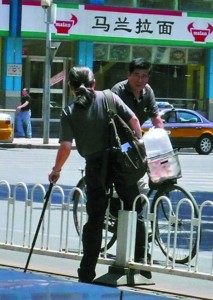 資料圖:劉歡拄著拐杖出行,并橫跨馬路欄桿
