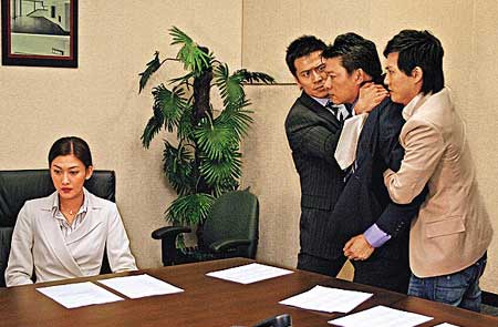 李彩華(左)在亞視新劇中飾演影射龔如心的集團女主席角色,昨日她與演夫婿的唐文龍(左二)、夫家成員詹秉熙(右二)和梁俊一,拍攝爆發爭權沖突的宣傳片。