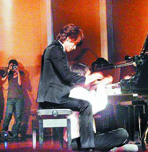 周董彈琴說愛的《不能說的秘密》大紅,言承旭在新戲《星心的淚光》也化身“琴圣”,可惜他琴藝不佳,須由替身“胯下”代彈,兩人十分尷尬,頻頻笑場,變成“男體交纏”的詭異畫面,引起臺下從外地趕來捧場的師奶粉絲兼臨時演員陣陣驚呼,他拍完后也直呼有趣,“我本來就沒鋼琴基礎,為拍演唱會表演已苦練了劇情需要的幾首曲子,但當天拍攝的曲目太難,因此讓替‘手’上場。”