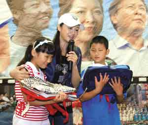 著名影視明星曹穎前天來到南京參加兒童電影《同一片藍天》的首映式,這部電影著重反映外來工子弟學生精神風貌。即日起將向全國中小學生公益放映。圖為曹穎在首映式上向從四川受災地區來寧讀書的王天幸、馬瑩雪轉贈學習用具。安福 婉愉 攝