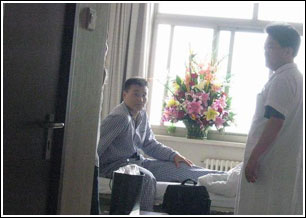 半個多小時后,一位醫生例行查房推開了任程偉的病房門,站在走廊里的記者看見任程偉身穿病號服斜躺在病床上,氣色有些灰暗,神情憔悴,雙腿好像不能動彈。他回答醫生問題時聲音也很微弱,與他前不久登臺領獎時神采飛揚的樣子簡直判若兩人,而醫生則一直在勸慰任程偉。醫生走后,病房里傳來了一陣手機鈴聲,任程偉強打精神地通著話,臉上露出勉強的笑容,通話結束后,他就疲倦地倒在了床上,熒屏上的硬漢此時看上去特別虛弱。隨后記者撥打任程偉的電話,電話已經關機,而他經紀人的電話也已轉到秘書臺,截至發稿時任程偉的病情還沒有得到進一步的證實。 卓偉