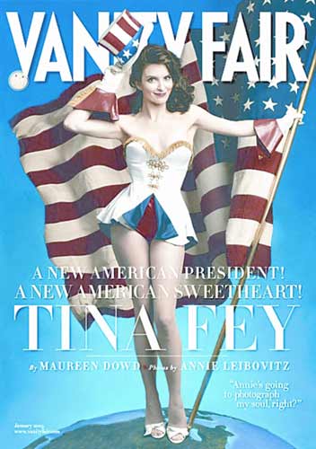 《名利場(chǎng)》雜志2009年1月號(hào)封面,邀在大選期間因模仿共和黨候選人莎拉·佩林而走紅的蒂娜·菲當(dāng)封面女郎。照片中,菲穿著美國(guó)國(guó)旗色的性感低胸超短裙,手執(zhí)美國(guó)國(guó)旗,神采飛揚(yáng),雜志封面的大標(biāo)題是“新美國(guó)總統(tǒng),新美國(guó)甜心”。蒂娜·菲還在該雜志的專訪中透露自己是扁平足患者。