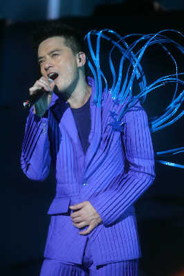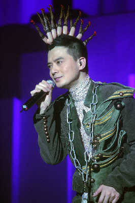 與其他流行歌手的演唱會相比,昨夜的上海大舞臺并未爆滿,但好在滿場都是黃耀明以及“人山人海”的死忠粉絲,所以當(dāng)周耀輝、當(dāng)李端嫻、當(dāng)AT17的ELLEN以及林一峰等人陸續(xù)入場,均收獲了粉絲的熱情尖叫。整個現(xiàn)場猶如“人山人海”與家人的節(jié)日聚會一般熱鬧,還未開場,內(nèi)場前區(qū)已經(jīng)擠滿了隨著音樂跳躍的歌迷。當(dāng)燈光全部暗下,伴隨著歌迷熱情的歡呼聲,黃耀明猛然出現(xiàn)在舞臺正中,幕布尚未全部拉開,身著白色羽毛褲的黃耀明唱起歌曲《下世紀(jì)再嬉戲》。戴著黃耀明經(jīng)典的妖精耳朵或者頭頂白色長發(fā)的歌迷們開始集體大聲跟唱。或許對于不少死忠歌迷而言,這場演出仍然伴隨著許多遺憾,比如黃耀明的造型在早前許多演唱會上用過,開場的帽子曾在“滿天神佛”演唱會上用過,羽毛褲則曾在“光天化日”演唱會上穿過,而后換上的第二套衣服也曾在“達明一派為人民服務(wù)”演唱會上用過。但每當(dāng)他下臺換裝,場內(nèi)便會響起一陣陣期盼的歡呼聲,甚至有歌迷干脆對著停下來與歌迷打招呼的黃耀明大喊:“講廣東話!”對歌迷而言,能夠一次看到“滿天神佛”、“光天化日”以及黃耀明與港樂合作的三場演唱會的精華,也算是不虛此行。