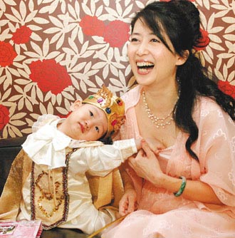 據臺灣聯合報報道,小寶弟穿上帥氣的王子裝,伸手要他最愛的公主媽媽抱抱,被醫師評為“長得超快”的頭圍戴不住王冠,不怕閃光燈的他卻不愿配合笑,但媽媽一句“裝可愛”口令,他馬上擠眉弄眼假笑,另一只手還老不自覺地往媽媽胸口抓,急得這孟庭葦猛護胸:“小寶弟,你對媽媽非禮喔!