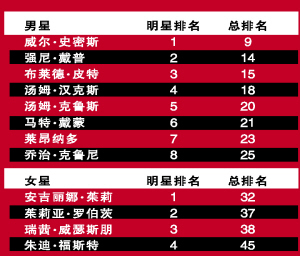 今年《諜影重重3》叫好又叫座,讓馬特·戴蒙身價5級跳,從去年26名躍登今年21名。女星方面妮可·基德曼、蕾妮·茲薇格今年都沒擠進前50名。