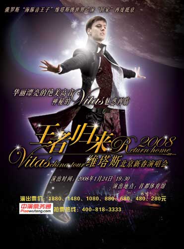 2007年6月之后,無數“粉絲”引頸期盼的下一輪巡演,在制作人曾經神秘的透漏“未來四年內將不會再來中國”的惋惜聲中,這次卻以迅雷不及掩耳的速度,將于第一輪巡演后半年再度展開。08年1月的首都體育館,將再次為維塔斯的高音歌聲所震撼。