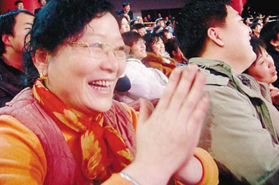 “‘裝’你們知道不?‘裝’在我們東北就是‘顯擺’的意思。你說我老師(指魏積安扮演的田教授)他多能裝呀!花5000塊錢買雙皮鞋,6000塊錢買塊手表,7000塊錢鑲口大金牙,然后一見我面就這樣:你看現在都8點了,我一會請你吃飯,你要不去我踢你……”這一段新加的臺詞配合著小沈陽夸張的齜牙咧嘴的動作,把現場的觀眾都笑翻了。坐在記者身邊一位40多歲的大姐一連笑一邊捂肚子,記者問她是東北人嗎?能聽懂小沈陽的笑料嗎?大姐還滿臉的納悶:“這還用分哪兒地方的人嗎?誰聽誰不樂呀!”從昨日的現場來看,為了突出小沈陽的個人魅力,有長達一分半鐘的時間都是小沈陽一個人在舞臺上脫口秀,而這段臺詞的“笑”果確實不同凡響,引起的笑聲比其余7分鐘都多。
