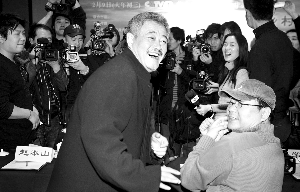 也許是一直沒有在春晚彩排現場出現,趙本山吊足了媒體記者的胃口,以至于在昨天的發布會現場,主創剛一合影結束,半秒鐘不到就圍上去二三十架機器,而且每一個麥克風都伸到趙本山前面不足5厘米的地方,別說采訪了,連對話都很難進行。