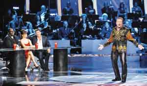 羅賓·威廉斯所穿的服裝非常姣,若他真的參賽,不知身旁那三位毒舌評委蘭迪·杰克遜、寶拉·阿巴杜和西蒙·考威爾會給出什么尖銳評價呢。