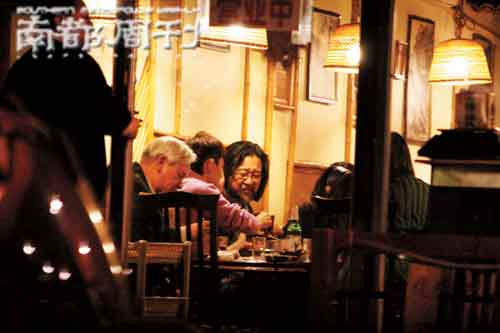 4月5日,話劇《暗戀桃花源》在保利劇院的最后一場演出結束后,導演賴聲川、主演黃磊孫莉夫婦和何炅、喻恩泰等一行人來到了簋街附近的一家火鍋店消夜,席間氣氛非常熱烈。記者看到在當天的飯席上除了孫莉和另一位女演員外,還有一位氣質不俗、妝容精致的中年女性坐在賴聲川的身旁,酒席上的明星大腕們對這位女性看上去非常尊重,每當她講話時,眾人都認真傾聽,不住點頭,顯示出她在“桃花源”劇組中的分量不輕。后來記者得知當天那位儀表端莊文雅的女性正是賴聲川甘居幕后的妻子丁乃竺。怪不得當天晚上,黃磊等大腕們對那位女性恭敬有加,原來是“老板娘”親自來慰問勞軍了。也許因為太高興,兩次出門接打電話的何炅手舞足蹈,肩斜腰軟,舉止活像搞怪的小姑娘。再加上他穿著粉紅色連帽衫,背著黑色時髦大包,還真容易誤認為是女孩兒。