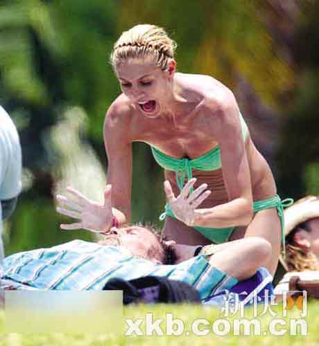 超模海蒂·克拉姆日前帶著雙親和孩子們到墨西哥海邊度假。盡管已為人母,但海蒂在雙親面前仍然如孩子般調皮,父親躺在海灘上休息,她趁其不備,張開雙手欲嚇父親,俯身時卻被狗仔隊拍到她小腹上層疊的肉圈。