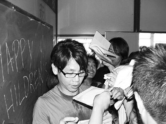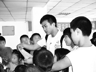 鄧超一來到武侯區愛心家園,馬上就被孩子們圍住了。鄧超問:“你們會唱什么歌?”幾十個孩子齊刷刷地響亮回答:“《感恩的心》!”當孩子們不約而同地唱響此歌時,鄧超也跟著唱了起來,他懷里緊緊抱著一個孩子,眼里閃著淚花。來自映秀鎮的13歲女孩陳兆鮮昨天非常高興,因為鄧超帶著大家高聲朗讀了她寫下的幾句話:“我高興,因為我們得到了好心人的幫助!我快樂,因為暴風雨過后又看到了美麗的彩虹……”
