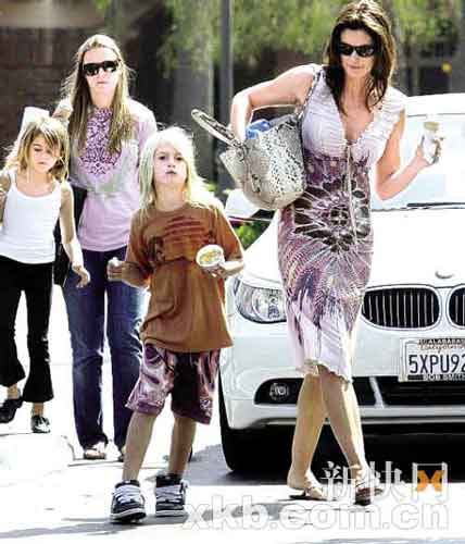 上周末,名模辛迪·克勞馥帶著兒子和女兒出游,享受閑暇時光。辛迪一身夏日休閑裝扮亮相,雖已年過40歲,但身材非常苗條。辛迪的兒子已經8歲,是個金發小帥哥。這個帥氣的小家伙和媽媽都手拿冰淇淋,其樂融融。辛迪的女兒6歲了,眼睛和母親長得很像,還遺傳了母親的棕色頭發,非常美麗。