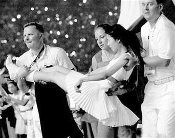 值得一提的是,當晚,有位白衣姑娘因透支體力而昏厥。在網上,一張照片記錄了這一幕:一位白衣MM不省人事,左手因抽筋痙攣而僵硬。讓人感動的是,這位姑娘暈倒在地后,第一時間抱起她的,是一位美麗的外國女運動員,兩旁還有兩位身穿白衣的外籍工作人員,一人托住她的腳,一人扶住她的頭,面露焦急,奔跑著,將姑娘送下場。這一幕,感動了無數網友,紛紛感謝這3位外國友人的熱心,并急切地搜索著他們的資料。“真誠的國際友誼啊!為這樣的和諧、友好鼓掌!”有網友在網上發了無數個“謝謝”來表達無法表達的謝意。