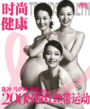 以關愛女性健康為宗旨的“粉紅絲帶行動”每年都會找一些女星來作宣傳。今年他們找來了懷胎9月的馬伊琍和陳沖、柯藍則拍攝了一組全裸照片,展現女性的自信和美麗。這組照片于日前公開刊發在《時尚健康》雜志上。