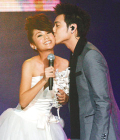 楊丞琳慶功會披婚紗 潘瑋柏主動獻吻(圖)