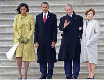 而作為離任的總統(tǒng)布什與勞拉的著裝讓人矚目,尤其是勞拉選擇素雅的淺灰色套裝,非常完美的展現(xiàn)了她柔和、高雅的氣質(zhì),而簡潔的款式與剪裁讓她看上去非常平和,似乎預(yù)示著她離去前平和的心態(tài)。