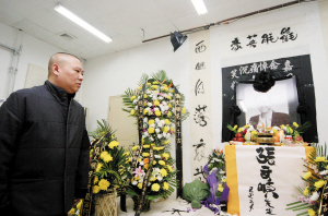 在張文順先生的靈堂內,記者發現,除了郭德綱為張文順老先生題寫的“東海風氣悲公一去空余恨;西山落日哀哉兩字不堪聞,橫批:氍毹英豪”的挽聯外,墻上還有一幅郭德綱親筆書寫的“一陣風留下了千古遺恨”的題字。當被問及這些文字的意義時,郭德綱表示,只是表達了自己的一種心情,據介紹,“氍毹”(qúshū)是古代人對于舞臺的另一種稱呼,張文順在表演中一向平穩樸實,又整理出眾多珍貴的單口相聲,郭德綱認為,稱張文順是“氍毹英豪”毫不過分。與春節期間在天津演出時的狀態相比,郭德綱瘦了不少,不過從精神狀態來看,昨日郭德綱的情緒已經平復了很多,神情上雖然仍是一臉落寞,但他向記者表示自己已經平靜下來了。
