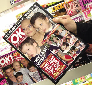 英國當地時間3月18日,《OK》雜志出版的特刊已經擺上了街頭。當時的杰德·古迪還處于彌留階段,而《OK》特刊的封面上已經印著“1981~2009”。封面上是杰德的遺言“我會在天堂看顧我的孩子”。