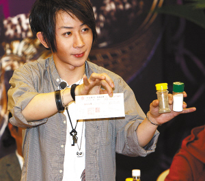 隨后,劉謙開始為現場的媒體記者表演了一個小魔術,只見他拿出了鹽與胡椒粉,將其混在一起,并脫掉了自己手上所有的戒指,把袖子也卷了起來,在瞬時把鹽和胡椒粉分開了。正當大家驚呼劉謙水平高時,劉謙突然自己給這個魔術解密。“這個魔術其實已經流傳了100多年了,這個胡椒粉其實是鐵砂,我手中藏了一塊磁鐵,只要用磁鐵一吸,鐵砂就從鹽中分離出來了。不過,我在5月8日首演時,將會把真正的混在一起的鹽與胡椒粉在10秒之內分開,這才是我最新的魔術。”