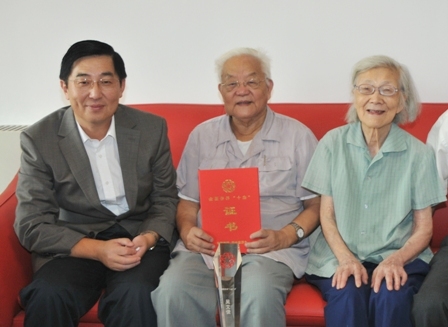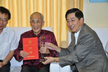 喬衛向兩位院士介紹了中國僑聯組織及與國務院僑辦聯合開展“全國僑界十杰”評獎的情況,仔細詢問他們的工作生活和健康狀況。喬衛代表中國僑聯向吳文俊院士和顏鳴皋院士頒發了“全國僑界十杰”獎杯和證書,并祝愿兩位院士健康長壽,生活愉快。