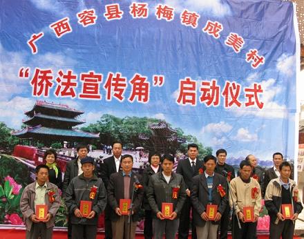 “僑法宣傳角”是國務院僑辦開展“五五”普法、宣傳《中華人民共和國歸僑僑眷保護法》及其實施辦法的一項重要舉措。玉林市外事僑務辦積極推薦并爭取到在楊梅鎮成美村設立“僑法宣傳角”。成美村有人口4000多人,有歸僑僑眷3600多人、海外僑胞4280多人,有僑屬企業2家。該村黨總支部、村委會辦公設施先進,功能室健全,每天到村辦事、開會、讀報、學技術、娛樂的人員均有百人以上,并重視宣傳僑法、維護歸僑僑眷的合法權益,聘請了27位村民小組長、村民代表為“僑法宣傳角”義務宣傳服務員。在這里設立“僑法宣傳角”,有利于廣泛深入地開展僑法集中宣傳活動,加大僑法宣傳貫徹落實力度,進一步營造愛僑、護僑、惠僑的良好社會環境。