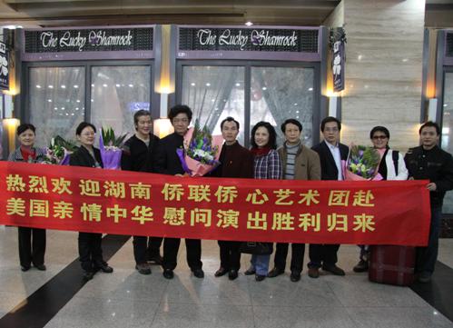 中新網2月11日電 據湖南省僑聯消息,經湖南省政府批準,由湖南省僑聯組團,湖南省僑聯、長沙市外事僑務辦公室、長沙市僑聯、開福區僑聯主辦,應美國有關僑(社)團的邀請,湖南省僑聯僑心藝術團于2010年1月23至2月8日,在紐約、洛杉磯、華盛頓、休斯敦、圣安東尼奧等城市“親情中華”赴美慰問巡演,圓滿成功,于2月9日載譽平安歸來。