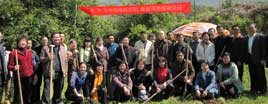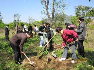 福建省僑聯(lián)副主席楊崢嶸、謝小建、福州市人大副主任陳樹雄、市政協(xié)副主席陳震宙、福州市僑聯(lián)黨組書記、主席藍桂蘭、福州市僑聯(lián)副主席、鼓樓區(qū)僑聯(lián)主席李盛玉、永泰縣僑聯(lián)黨支部書記汪秀錦等領(lǐng)導(dǎo)與青年委員和僑聯(lián)機關(guān)干部共同栽下近百株的桃樹和桂花樹,并細心地為每棵樹苗系上簽有自己名字的綠葉圖形標(biāo)識,寓意僑聯(lián)事業(yè)與樹苗一同成長壯大、煥發(fā)生機活力。