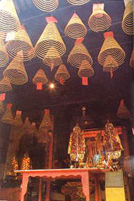 在澳門蓮峰廟中,香客將自己祈求的愿望寫在紅紙上,系在盤香上。