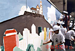 圖片說明: 澳門兒童在街頭工地圍板上繪出城市風光,以美化環境。