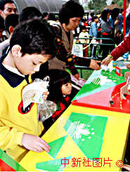 一名兒童在"喜迎澳門回歸,共創美好明天"園游會上認真地拼裝澳門特區區旗圖案。澳門為紀念澳門基本法頒布六周年,于二十八日開始舉行系列活動,以增強人們的回歸意識。