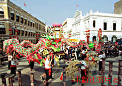 澳門議事廳前地獅龍齊舞,歡歡喜喜慶賀農歷兔年的到來。